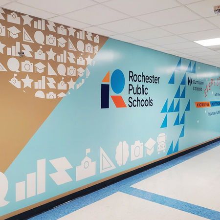 Bold vinyl applications, dynamic shapes, and dimensional graphics helped bring the Rochester Public Schools rebrand of the Edison Building to life. We truly value the opportunity to collaborate with Minnesota schools on impactful design work.